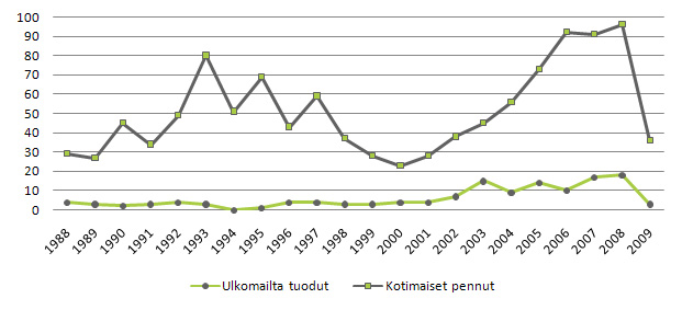 Taulukko 2. Bostoninterrieri, syntyneet pennut 1988 - 2009 (eriteltynä kotimaiset ja ulkomaan tuonnint)