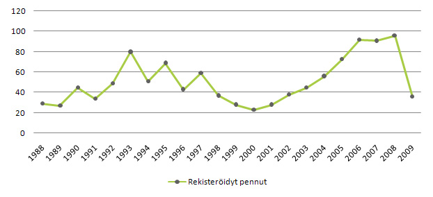 Taulukko 1. Bostoninterrieri, rekisteröidyt pennut 1988 - 2009 (syntyneet ja ulkomaan tuonnit yhteensä)